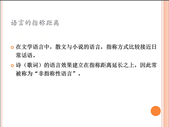 首先,陆正兰教授提出歌唱是对“歌词”的延长与美化,在对古代书籍中的“长言”释义中提出自己的观点:“长言”既是物理形态的发声音长,也指语言的指称距离拉“长”。随后,陆正兰教授围绕歌词的指称距离展开讲解,对比小说、散文等其他文学体裁的语言的指称方式,指出在歌的语言指称距离延长最为明显,经常明显地跳过外延对象。而语言的指称距离变异的问题,一是来自于各种词语的指称距离原本就不一样,从而使得指称相当不清楚。而另外一种指称距离差异,是由体裁引发的整体性指称距离延长。在不同体裁中,所有的词语指称距离都会发生变化。即,在一个文本中所有的词语,比在另一种体裁的同样词语,指称距离或更长或更短,陆正兰教授称之为“体裁指称距离”。其中,最极端的“非指称化”是中国的“兴”。歌词中“兴”的功能重在作出情调性的呼,导入并烘托感情,不一定需要关联,从而摆脱了上下文需要的指称性。