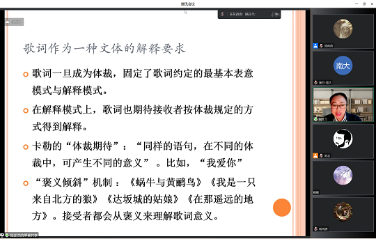 最后,主持人刘念老师对陆老师本次演讲进行了学术总结,明确陆正兰教授著作《歌词学》开启了我国歌词研究,并构建了一个中国现代歌词研究理论框架,具有很强的开拓意义。