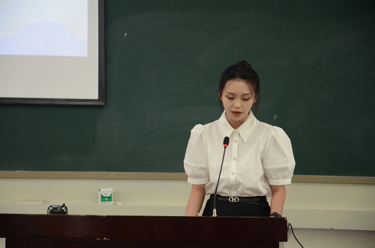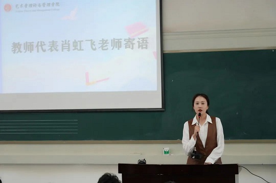 艺术史论2+2班陈欣言作为新生代表与大家分享了迈入人生新阶段的心得体会,表达了自己对大学生活既期待又焦虑的状态。同时引经据典,借蝉“蛰伏于地下十余年终破土而死”感慨人生之短暂,强调奋斗正当时,希望自己在大学阶段的学习能够实现从零到一,将理论变成实践,绽放青春绚丽之花。