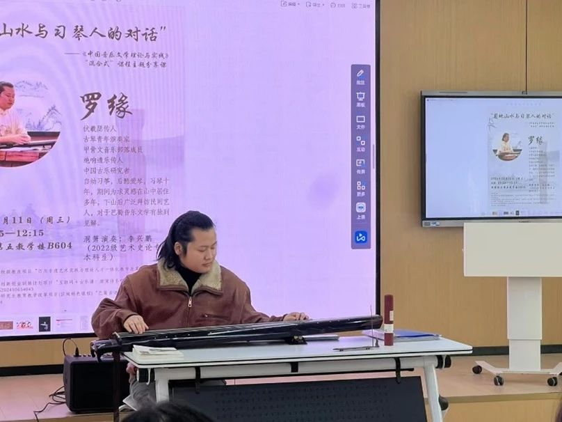 罗缘:自幼习筝,后转而酷爱古琴,习琴十年间,为寻求创作灵感,曾在山中居住多年,深入自然,感悟音乐与自然的和谐共生。下山后,他广泛拜访民间艺人,对巴蜀音乐文学有独到的见解。在课堂上,罗缘不仅分享了自身的学琴经历,还讲述了在深山中三年练琴的趣事,让同学们深刻感受到了他对古琴艺术的热爱与执着。罗缘通过生动的讲解和演奏,向同学们传授了古琴的基本知识、演奏技巧及文化内涵。