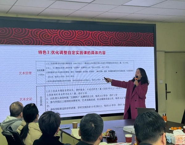 本次自评汇报工作,由格桑梅朵院长主持并做主要汇报。她指出,艺术学理论与管理学院的教学工作主要依托于艺术史论、艺术管理两个专业,在近几年的不断发展中,始终坚持以党建引领教学科研,坚持史论结合、道技并举、理论性与应用型并重的方针,在专业建设、课程建设、人才培养等方面取得了成效。其中,艺术史论专业作为四川省一流专业,在近年的发展中充分挖掘西南地方艺术特色与文化优势,在巴蜀艺术史、藏羌彝艺术史、西南地方文化与艺术美学研究、西南地区非遗艺术研究等建设特色课程群、特色人才培养等取得了一定成绩;艺术管理专业在近年的发展中主要围绕对标伟德bv国际体育发展的总目标,同时围绕成都国际音乐之都的建设,在艺术与公共文化服务、非遗旅游管理、艺术赋能文旅融合等领域设置人才培养方案,进行课程建设。在“艺术理论+”“艺术管理+”复合型人才培养建设思路下,形成了符合学院特色的“课程思政+实践创新”的第二课堂活动。