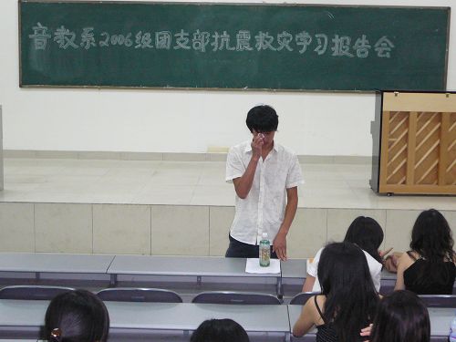 2008年6月6日下午,音乐教育系2006级学生在系党总支的关心与支持下,由团总支副书记王蜀南老师在阶梯教室主持召开了 “音乐教育系抗震救灾学习报告会”主题团会。会上,抗震救灾志愿者支振旭、李朋霞、贾微波、钱鑫、尹诗凯等同学讲述了在一线当志愿者期间的见闻和感受,用当时拍下的照片讲解了一些令人感动的真人真事,以直观的方式让同学们真实感受到了受灾地区的状况。同学们反响热烈,热泪盈眶,不断地讨论和举手提问,并表示了自己欲做志愿者的决心,准备用自己的方式表达自己对受灾群众的关心。 这次活动让同学们深受感动,增强了大家对生命的热爱之情。同时,我们欣喜地看到新一代大学生强烈的民族意识以及在灾难来临时团结一心的优良品质,显示出了“80后”人的勇敢无畏、坚强不屈的精神面貌。