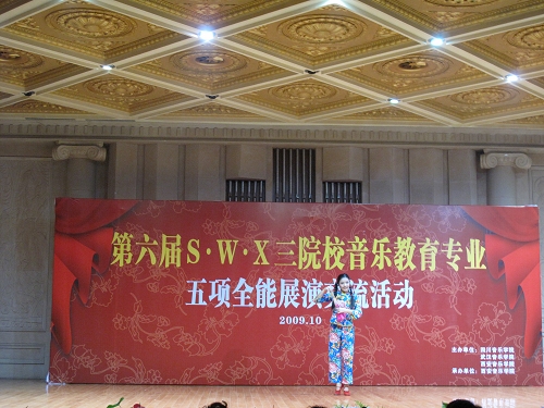 2009年10月26日—30日,第六届四川、武汉、西安三音乐学院(swx)音乐教育专业五项全能展演交流活动在西安音乐学院隆重举行。本次活动内容丰富,除五项全能展演外,还有中国教育学会音乐教育分会主持的全国教育科学规划教育部重点课题“音乐教师培养国际比较研究”子课题——“全国专业音乐院校音乐教师教育研究”结题会、全国专业音乐院校音乐教育系系主任论坛以及全国专业音乐院校音乐教育系教研室主任工作交流会等活动。 我系在学院的关心支持下,组成了近二十名师生的参会队,参加了本次各项交流活动,并于27日晚在西安音乐学院学术厅举行了展演音乐会。四名选手分别就声乐演唱、钢琴演奏、自弹自唱、合唱指挥、舞蹈五个项目进行了精彩的展演,博得了各位专家的一致好评,现场观众的掌声经久不息。 比赛结束,我系四名选手分别获得全能第一和各个单项第一的好成绩。西安音乐学院党委书记安宁教授登上舞台,向我系师生表示祝贺,并合影留念。