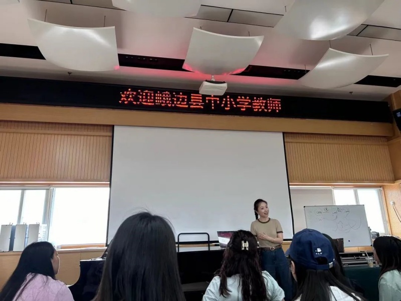 2024年5月18日,“音你而美,育见未来”乡村美育公益计划开展了第一场活动——峨边县中小学音乐教师培训。音乐教育学院党委书记、院长王志昕教授首先代表学院对到来的教师们表示热烈欢迎,随后向教师们介绍了我院凉山彝族自治州顶岗支教课堂“以学促学 以行践学”的融合教学法实践,并在了解教师们的基本情况后,为大家安排了相关课程。我院声乐教研室韩悦副教授进行了歌唱与教学专题讲座,结合经典艺术歌曲《我爱你,中国》,从赏、诵、比、思、创五个环节进行了讲授,通过分析音乐要素、感知节奏韵律、了解音乐结构以及伴奏织体到最后的创编展示,向教师们展示了课程中师生互动与生生互动的良好教学效果和艺术呈现。舞蹈教研室白渝教授向老师们介绍了非遗中的文化之美——原创儿童舞蹈《川菜魂·豆瓣乐》的美育创作,从郫县豆瓣、豆瓣制作中的美育内容和将非遗文化之美运用于儿童舞蹈展示三个方面讲解了四川传统文化与美育教育的结合实践。理论教研室青年教师聂榕以柯达伊教学理念为基础,结合声势律动和歌唱游戏,为老师们带来一堂感知节拍与变拍学习的互动音乐课展示。