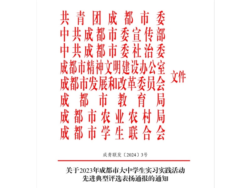 为深入学习贯彻党的二十大精神,落实习近平总书记关于青年工作的重要思想,教育引领全市青年学生在实习实践中增强责任感和使命感,以实际行动走进城乡基层,自觉融入到成都的发展建设中,团市委、市委宣传部、市委社治委、市文明办、市发改委、市教育局、市农业农村局、市学联号召全市大中学生深入基层围绕重点方向开展各类社会实践活动。伟德bv国际体育音乐教育学院积极响应号召,并在2023年成都市大中学生实习实践中被评为先进单位。