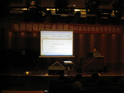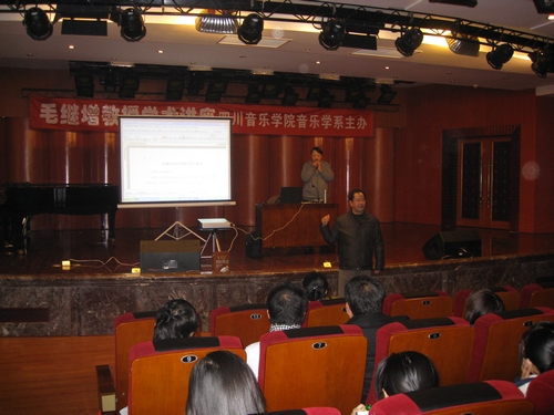 2009年12月9日下午14:30,我院老校友,中央民族大学音乐学教授,国家重点课题《新疆传统音乐文化实录》负责人毛继增教授,应我系邀请,在聂耳音乐厅举办学术讲座。 三个多小时的讲座中,毛继增教授为我们讲述了民族音乐学田野工作的点滴。主要从“田野工作的重要性”、“我的两位学习榜样”及“田野工作前的准备”等方面介绍的。他结合自己长期在田野采风中的亲历亲为,让在座各位从他广博的田野工作经验中认识到要搜集、研究民族音乐,只有深入民间,才能找到真正纯朴原始的传统音乐。 最后,毛继增教授给我们分享了他采风时的照片资料,深受全场师生欢迎。许多学生在讲座结束时,纷纷表示,毛教授的切身经历使自己受益良多,身为音乐学专业的学子,要以毛教授为榜样,竭力为民族音乐做出自己的贡献。 在接下来的10日、11日两天,每天下午14:30—17:30,毛继增教授还将为我们带来关于“雪域(西藏)音乐鸟瞰”及“‘曲高和众’和维吾尔族木卡姆艺术”的精彩讲座。 摄影:蒋晓蕾