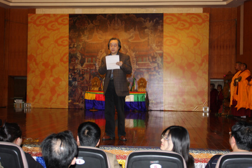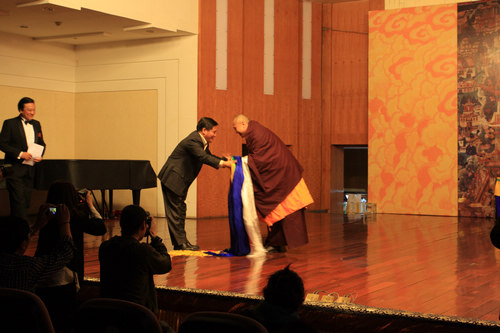 伟德bv国际体育院长易柯、四川省觉囊梵音代表性传承人嘉阳乐住金刚上师出席了展演活动并分别讲话;四川省文化厅副厅长泽波上台祝贺并向觉囊梵音代表性传承人嘉阳乐住金刚上师敬献哈达;来自中国艺术研究院音乐研究所、中央民族大学音乐学院、四川省非物质文化中心、四川省音乐舞蹈研究所、伟德bv国际体育音乐学系的部分领导和专家以及川音师生有幸观看了展演。