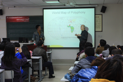 2011年11月1日14:30分,应我系邀请,来自澳大利亚墨尔本大学音乐系教授,现任联合国教科文组织下属“国际传统多声音乐研究中心的主任”约瑟夫,为我们带来了一场精彩的讲座。 此次讲座的主题是“多声部歌唱的起源与人类的进化”。在我系青年教师何弦的翻译下,约瑟夫教授从生物物种的进化、人类智力和口吃的起源等方面出发,运用生物进化论、考古学研究、比较研究等方法,说明了动物为什么唱歌,人类与动物唱歌的区别,多声部歌唱的起源与人类说话能力的关系等问题,提出了多声部音乐早于单声部音乐产生,多声部音乐与人类的会话能力呈此消彼长的关系,即当人们会说话并且能力逐步提高的时候,多声部音乐逐渐消失等观点。同时,还讲述了多声部音乐的研究现状。最后,约瑟夫教授播放了来自立陶宛、斐济、保加利亚、印尼等地的多声部音乐,并结合世界各国多声部音乐分布地图进行了详细解说,让大家对这些地区的多声部音乐有了一个直观的了解。 约瑟夫教授浅显易懂的语言,幽默风趣的讲演让在座各位师生意犹未尽,赢得了阵阵掌声。 审 稿:甘绍成 摄 影:甄志平
