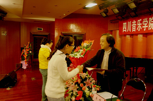 最后,音乐学系2010级获奖学生代表王枝萍发言:“大学三年以来第一次站上音乐学院的舞台,既然是以领奖的方式,让我感到既兴奋、又紧张。这次能够拿到伟德bv国际体育音乐学系‘忠勇奖励基金会’颁发的‘忠勇奖’,对我来说是一件天大的喜事,也是一种莫大的鼓舞。这不仅是对我在过去两年学习上的肯定,更是我继续努力前行的最大力量。首先,我要表示感谢,感谢‘忠勇奖’的创立者李忠勇院长遗孀何福琼老师及其子李山、李星先生。谢谢你们对音乐学系教育事业的关心和对音乐学专业学生在学习上的鼓励与支持。第二、我要感谢学院的领导对我们音乐学系学生的关心与厚爱,谢谢你们在百忙之中抽出时间来为我们颁奖。第三、我要感谢担任‘忠勇奖励基金会’的所有评审委员,感谢音乐学系的所有领导,能给我这次机会,让我能获得这个荣誉;第四,我还要感激所有教过我、关心我的老师。”