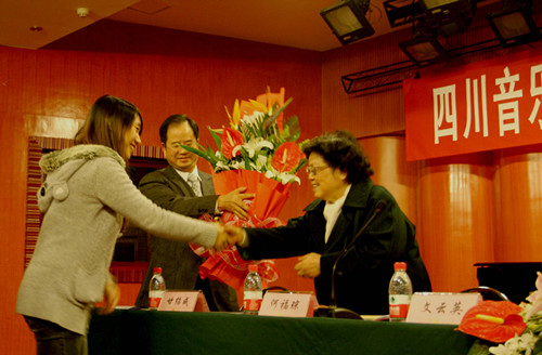 接下来,在台上就坐的领导、老师先后发言。首先,易院长代表学校领导,高度赞扬和缅怀了李忠勇教授生前“一身正气,两袖清风”,爱岗敬业、爱校如家、埋头苦干的崇高品格和工作作风。在介绍了“忠勇奖”与音乐学系的特殊渊源后,易院长不仅列举了李忠勇教授生前在创作、教学、管理等方面的诸多感人事迹,同时对在音乐学系设立“忠勇奖”这份首开先河的荣誉寄予了殷切期望。其次,“忠勇奖励基金会”名誉会长、李忠勇院长遗孀何福琼老师,在衷心感谢学院领导的理解与支持和音乐学系的大力协作的同时,特意向大家说明了“忠勇奖”的设立是遵从李忠勇生前在电脑中的留言:“一个平凡的人,来去平平凡凡为好。丧事从俭,不收花圈、礼金。”“为尊重他的遗愿,我和犬子李山、李星于去年岁末商定,将亲友所赠之丧亡慰问金(71380元)和学院发放的抚恤金(28620元)共计拾万元,转化为这个奖励基金。区区十万元虽微不足道,但都寄托了我们无尽的哀思。奖励基金之所以设在音乐学系,是因为李忠勇同志在担任院长工作期间鼎力谋划、筹备并获得党委的认同和高教局的批准而于1994年成立了音乐学系。其意在办好音乐学院的龙头专业。”何福琼老师这样说道。会上,音乐学系首任系主任颜曼秋老师以《忠勇坦诚,大爱无垠》的发言,表达她对忠勇师长特殊的缅怀与敬意。音乐学系老教师匡天齐教授则以李院长同班同学的身份,介绍了李忠勇教授早年读书、工作的感人事迹,以及他热心助人的高尚品格。另外,教务处副处长文锋教授以李忠勇教授学生身份做了题为《怀念恩师李忠勇先生》的发言。他说:“我认识李老师已有20年时间,我跟随李老师进修学习一共有5年时间,我自认为,我是接受李老师关怀和教诲最多的人。李老师是我心目中最伟大的老师,最慈爱的长辈,最亲切的朋友。”他是一个品德高尚的人,一个心胸开阔的人,一个博学多闻的人,一个治学严谨的人,一个诲人不倦的人。