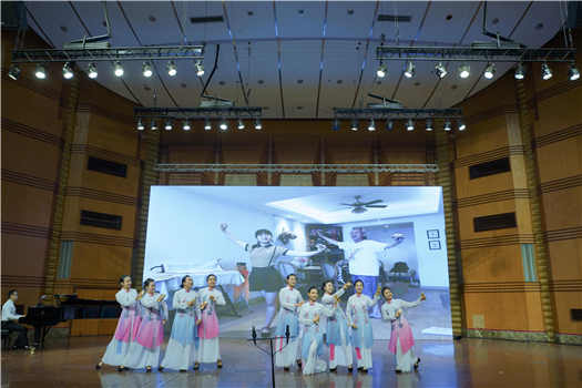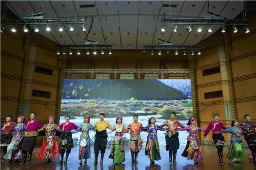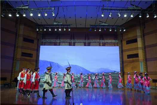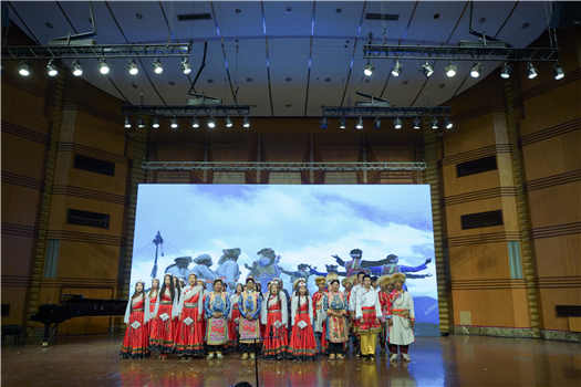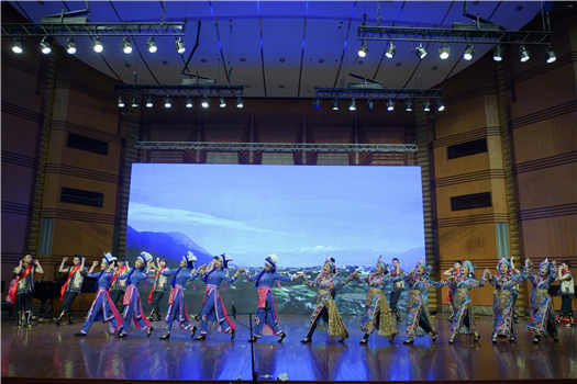 第二个节目是由音乐学系和民族声乐系学生们共同表演的嘉绒藏族民歌《吆牛歌》《打麦歌》,表演者歌声优美,舞蹈刚健有力,仿佛把观众带到了当地人民在田间地头耕作劳动的场景。