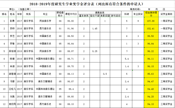根据《伟德bv国际体育2018—2019学年度研究生学业奖学金评选办法》,本着公开公正的原则,由音乐学系(硕士研究生)学生本人提交申请,经音乐学系研究生奖学金评审小组成员(党政领导,导师代表、教学秘书、学生代表)的共同审核,在音乐学系纪检委员的监督下,最终评选出2018—2019年度学业奖学金的获奖学生,见上图。公示时间:2019年9月29日——2019年10月8日。如有异议,请于公示期内到音乐学系办公室(琴房大楼309)当面反映。
