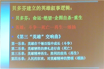 王教授认为,古希腊悲剧中的“崇高”潜移默化地影响着贝多芬。而贝多芬音乐中的“崇高”可以从其题材内涵和结构形式来解读。在题材内涵方面,贝多芬倾向采用强大的“英雄性修辞”。他极为关注社会政治的重大事件,如《第三(英雄)交响曲》、《威灵顿的胜利(战争)》交响曲、《菲岱里奥》等作品就是这一题材的直接反映。同时他也关注古希腊古罗马的神话题材,如芭蕾舞剧《普罗米修斯的神灵》、《雅典的废墟》、《科里奥兰》序曲等。王教授特别指出,贝多芬对“英雄事迹”的题材情有独钟,如《艾格蒙特》、《斯蒂芬王》。这些作品中的英雄都具有领袖气质,不畏强暴且不惧艰难,坚韧果敢且雷厉风行,充满着反叛、冒险、牺牲精神,最终都建功立业或走向毁灭。