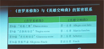 在王丹丹教授看来,贝多芬战胜自己,从绝望到重拾信心这一转变,不仅促成了其内心理想的“英雄”生成,更丰富了其音乐作品中的“英雄形象”。如下图所示,贝多芬的芭蕾舞剧《普罗米修斯的生民》与《第三(英雄)交响曲》紧密关联,前者正是后者的主题来源。在题材内容上,“创造”和“引领”式的普罗米修斯就是贝多芬心目中的“英雄”。