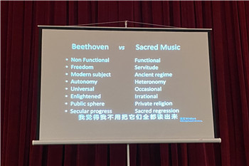 讲座伊始,蔡教授就通过一个悖论引出了此场讲座的主要内容:与圣乐有关,但却聚焦于一位非圣乐作曲家——贝多芬。蔡教授认为:“贝多芬通过重新定义圣乐,将自己排除在这一领域之外,这其实是贝多芬的无心之举。”在蔡教授看来,该观点从一定意义上来说,是一个“神话( myths)”,并以“半真半假”的姿态存在。为了论证这一观点,检视该“神话”的运作方式,并找出其中存在的问题,蔡教授首先探究了该“神话”形成的三个步骤。