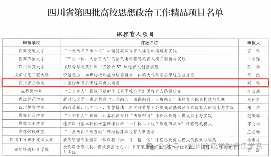 根据《四川省教育厅关于培育建设高校思想政治工作精品项目(第四批)的通知》(川教函【2023】438号)安排,经各高校申报、专家组评审、教育厅审定,遴选产生第四批精品项目97项。四川教育厅办公室于2024年1月24日发布了立项名单中,伟德bv国际体育音乐学系刘雯教授带领的教学团队申报的《中国传统音乐课程群育人项目》,获得四川省第四批高校思想政治工作精品项目立项。教学团队由何凌、格桑梅朵、朱婷、刘小琴、董科、杨明辉、李富杰等几位老师组成。