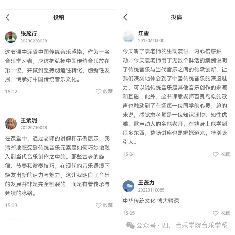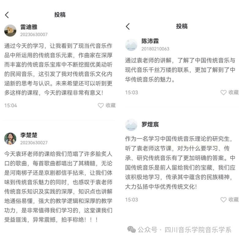 本次袁环老师的直播课是极具生动性与震撼性的,袁老师以娓娓道来深入浅出的讲授、逻辑严密的课堂内容、丰厚的知识储备以及深厚卓越的唱功,赢得了全场师生的热烈掌声。以是部分同学们对本次课程内容的收获与投稿: