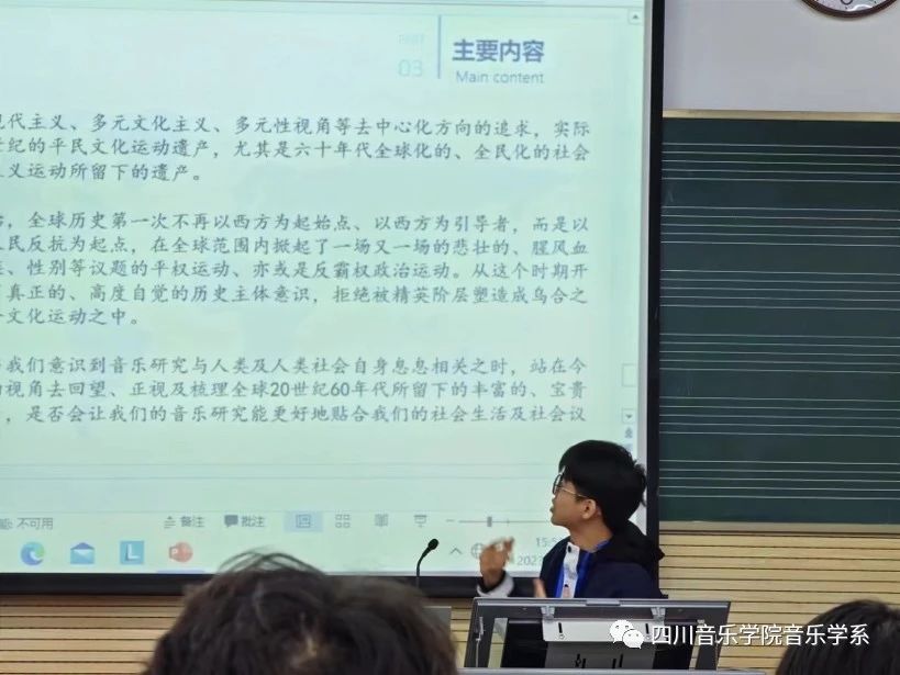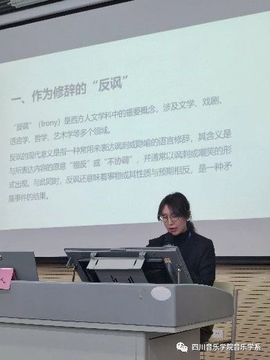 李格格老师在“西方音乐史学史理论与经典史著文献研究专题小组”中发言,针对音乐中的“反讽”现象进行了分析和梳理,作了题为《音乐中的“反讽”:修辞策略与意涵诠释》论文宣讲。