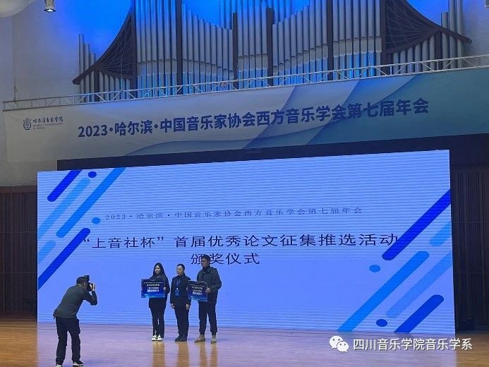 年会于21日晚闭幕。在闭幕式上,会长杨燕迪教授首先邀请学会前辈汪申申教授做了发言,汪教授从自己的经历出发,回顾了年会的发展历程,并对青年学子们在未来的学术研究上寄予了深厚的期望。哈尔滨音乐学院学报《北方音乐》的常务副主编田可文教授也针对学报的投稿、发表等事宜做了介绍。上海音乐出版社国际事业部主任段劲楠介绍了出版社的相关情况。然后,开幕式进入到了激动人心的论文颁奖环节,我系2021级研究生郑诗涵的论文获得硕士组“论文优胜奖”,2019级本科生、2023级研究生陈乐潇获得本科组“优秀论文奖”。