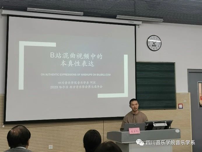 何弦副教授在“西方现当代音乐与媒介专题小组”发言,针对网络音乐的数字化审美现象进行了剖析,作了题为《B站混曲音乐视频中的本真性表达》论文宣讲。