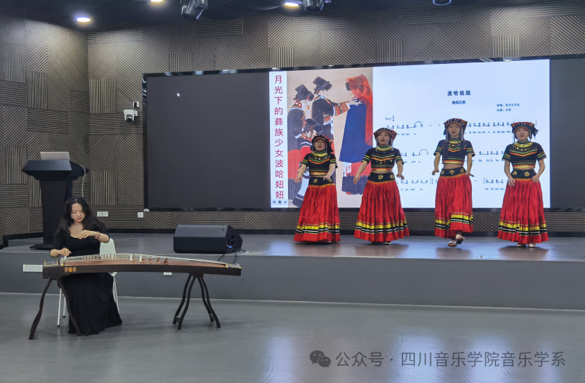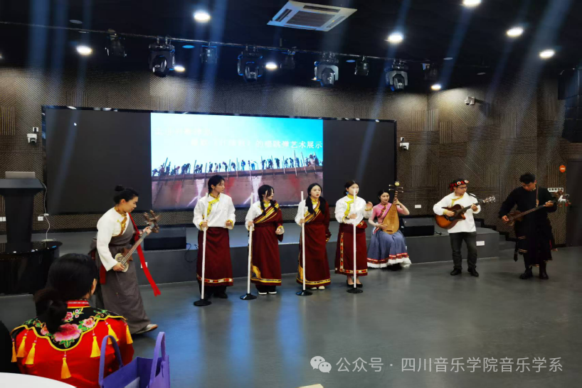 本次实践汇报共分为八组,每组从藏族、羌族、彝族三个少数民族音乐中精心挑选了一首乐曲进行详细讲解与生动演绎。在展示过程中,各组均安排了一名同学负责阐释所选乐曲蕴含的情感内涵和创作背景,旨在为听众提供更为丰富的音乐理解维度,帮助他们更深入地领略音乐所要传达的情感与意境,从而更好地融入音乐所营造的情境之中。在表演环节,同学们身着藏羌彝民族服饰,全情投入音乐的演绎中。一些同学通过载歌载舞的形式,充分展现音乐的活力与灵动,使观众能够直观地感受到音乐的韵律之美;另一些同学则借助古筝、琵琶等中国传统民族乐器及藏族传统乐器扎木聂,精准演奏出藏羌彝民间音乐的特有旋律和音色,赋予这些民族音乐新的活力。通过这种多样化的表现形式,实践汇报成功地将不同文化融合在一起,呈现出和谐多元的文化景象,充分彰显中华民族音乐文化的深厚底蕴和独特魅力。