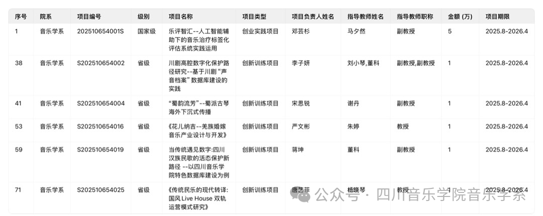 省级5项其中包括杨晓琴教授指导、唐艺菲同学负责的《传统民乐的现代转译:国风Live House双轨运营模式研究》;由朱婷教授指导、严文彬同学负责的《花儿纳吉——羌族婚嫁音乐产业设计与开发》;谢丹副教授指导、宋昭晏(曾用名:宋思锐)同学负责的《蜀韵流芳——蜀派古琴海外下沉式传播”聚焦蜀派古琴海外传播》;由刘小琴副教授、董科副教授联合指导、李子妍同学负责的《川剧高腔数字化保护路径研究——基于川剧‘声音档案’数据库建设的实践》;由董科副教授指导、蒋坤同学负责的《当传统遇见数字:四川汉族民歌保护的活态保护新路径—以伟德bv国际体育特色数据库建设为例》。