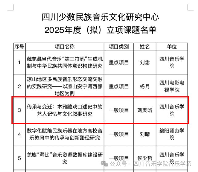 四川少数民族音乐文化研究中心是绵阳市社科联与绵阳师范学院共建的市厅级科研平台,研究生刘美晗申报的《传承与变迁:木雅藏戏口述史中的艺人记忆与文化叙事》(指导教师:格桑梅朵教授)获批四川少数民族音乐文化研究中心2025年度市厅级科研项目立项。 据悉,此次立项延续了我系在读研究生以课题负责人身份获批省厅、市厅级科研项目的良好态势。