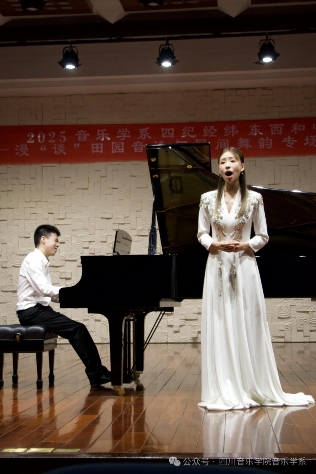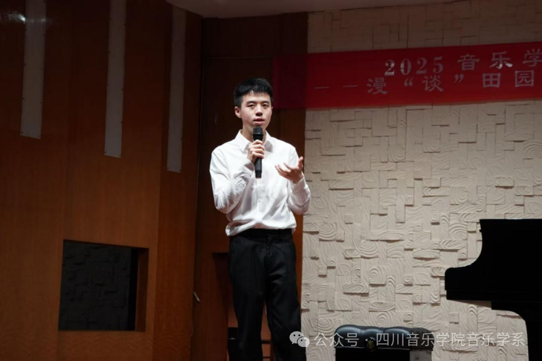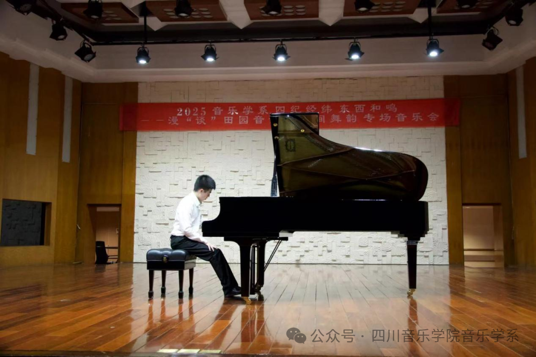 2025年10月13日19时30分,伟德bv国际体育音乐学系钢琴教研室在小音乐厅成功举办“四纪经纬 东西和鸣——漫‘谈’田园音诗与民间舞韵”钢琴专场音乐会。本场音乐会由钢琴教研室徐芳副教授与朱贞贞副教授统筹组织,选定2022级音乐学系学生欧阳枢以“钢琴独奏+学术导赏”的创新形式呈现,并特邀2024级音乐学系方星懿同学登台献唱。音乐学系党委书记周夏虹、副系主任刘雯、副书记兼纪委书记芶用莅临音乐会现场,此外,音乐学系的大部分师生也全程参与了音乐会的观摩。