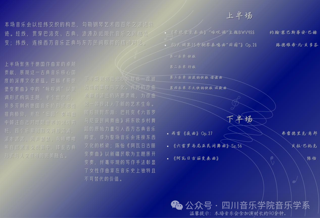 本场音乐会不仅是音乐学系钢琴教研室首次助力学生以讲座式音乐会(Lecture - Recital)的形式面向全校公演,更是教研室在学术研究与艺术实践领域的一次重要探索,充分彰显了教研室在课程设计、学术研究与舞台呈现方面的深度融合。钢琴教研室教师通过鼓励学生将理论思索与演奏实践进行有机整合,切实拓展了音乐学系钢琴演奏课程的内涵与外延,为培育兼具学术素养与艺术表现力的复合型人才发挥了积极作用。