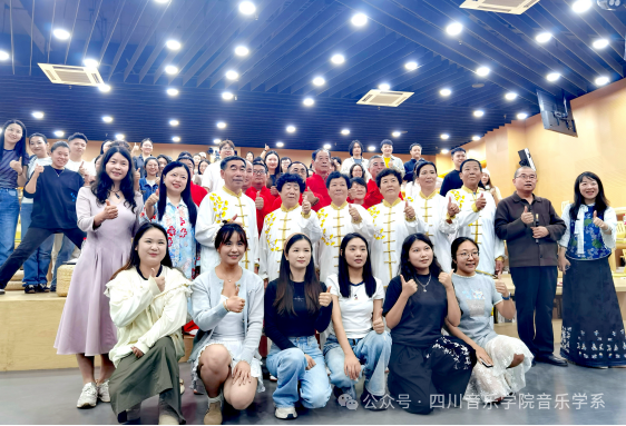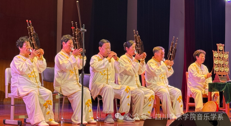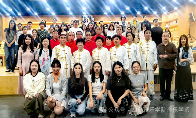 在《冀中笙管乐与雄县古乐的民间活力》部分,胡庆学介绍了流传于冀中地区近30个县市的“音乐会”文化,这种音乐形式以管子领奏、笙管和奏为特色,乐队包含笙、管、笛、云锣及打击乐器,曲目分为套曲、小曲和打击乐三类,与本地礼仪、丧葬等民俗活动紧密结合。胡庆学还特别提到雄县音乐会,雄县是冀中笙管乐的集中区域之一,雄县古乐相传起源于宋元,盛行于明清,繁盛时期,曾有20余家民间音乐会活跃。2008年雄县古乐被确定为国家级非物质文化遗产,代表乐社包括建于明永乐年间的开口村音乐会和建于清乾隆年间的赵岗村音乐会等。 讲座尾声,胡庆学带领团队现场演奏了冀中笙管乐雄县古乐,让师生们近距离感受古乐的魅力与韵味。最后,全体师生与胡庆学团队合影留念,记录下这一文化交流的珍贵时刻。