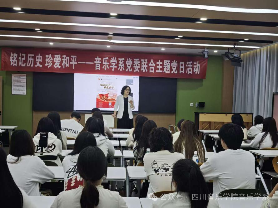 为深入学习领会习近平总书记在纪念中国人民抗日战争暨世界反法西斯战争胜利80周年活动上的重要讲话精神,弘扬抗战精神,传承红色文化,10月22日下午,我系党委组织党员师生以线上线下相结合的方式,在教学楼609室共同参与了“铭记历史、珍爱和平”联合主题党日暨千人同上一堂思政大课活动。此次活动由哈尔滨音乐学院党委组织部、宣传统战部、音乐学系党总支及侵华日军第七三一部队罪证陈列馆共同策划开展,汇聚了全国十余所专业音乐院校音乐学系(人文学院)和艺术院校音乐学院党委的千余名师生代表参加。