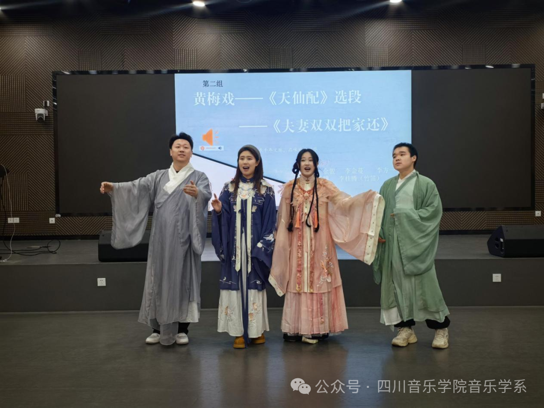 2025年12月16日中午,伟德bv国际体育音乐学系研究生课程《中国传统声乐专题选讲》期末实践汇报在武侯校区201智慧教室精彩上演。本次汇报由董科老师与刘小琴老师联合指导,五个研究生小组精心筹备,以精湛的技艺与饱满的热情,为师生们呈现了一场融合传统民歌与戏曲精髓的视听盛宴,生动诠释了中国传统声乐的独特魅力。