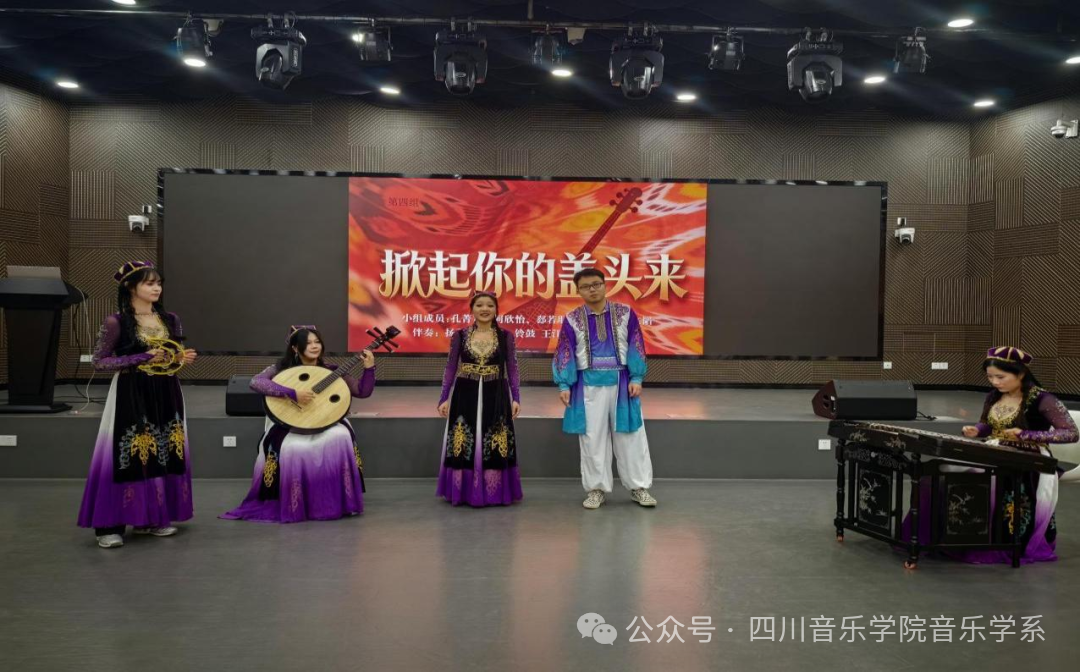 第四组孔菁菁、何欣怡、郄若琨、王江玉、孙文韬同学则以新疆民歌《掀起你的盖头来》,将西域风情搬上舞台。成员们的演唱与扬琴、铃鼓、大阮等乐器默契配合,欢快的旋律与热情的节奏将现场气氛推向高潮,充分展现了少数民族音乐的独特魅力。