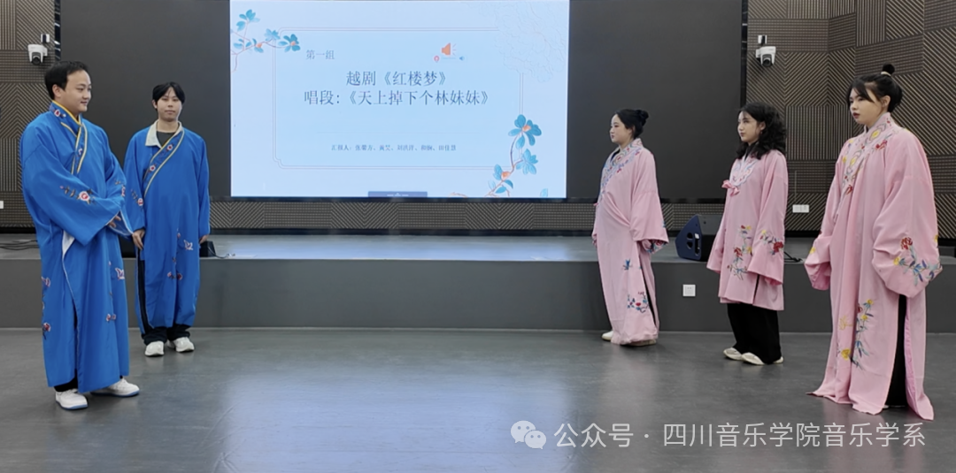 汇报伊始,第一组张馨方、黄昊、刘洪洋、和娴、田佳慧五位同学率先登场,带来越剧经典《红楼梦》选段《天上掉下个林妹妹》。她们以婉转清丽的唱腔,细腻描摹出宝黛初遇时的灵动娇羞,将江南越剧的柔美典雅展现得淋漓尽致,瞬间将观众带入红楼梦境,赢得满堂喝彩。