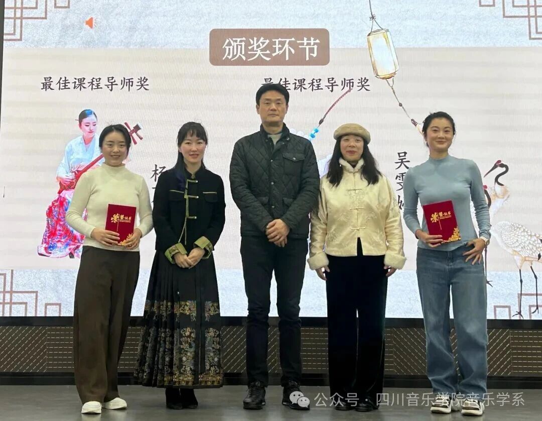 演出尾声,音乐学系两位领导走上舞台,为参与课程教学与排练指导的杨夏、吴雯婷老师颁发“最佳课程指导教师奖”。这一环节既是对两位青年演员专业付出的认可,也彰显了课程在校内教学与行业实践之间搭建的紧密桥梁。