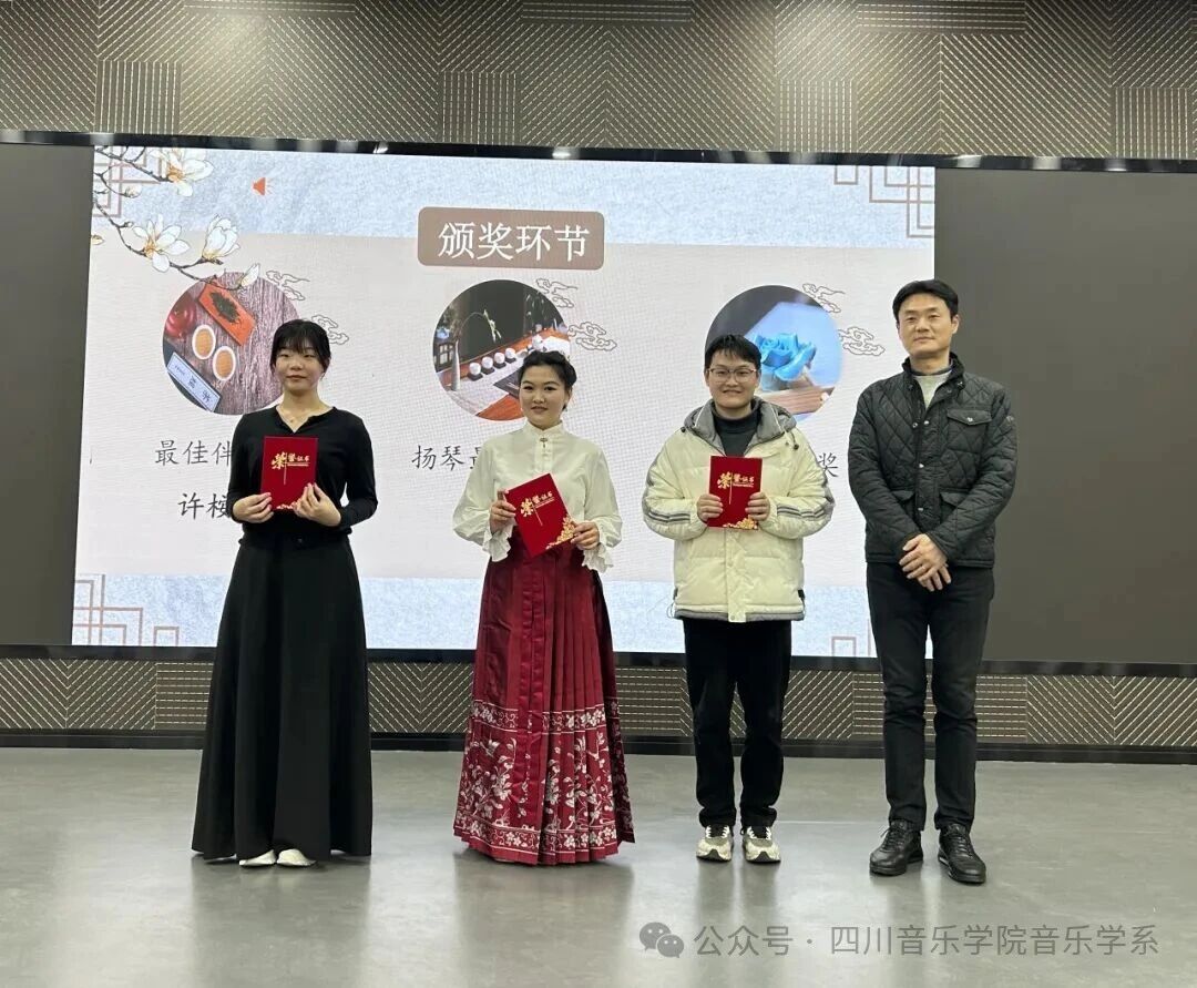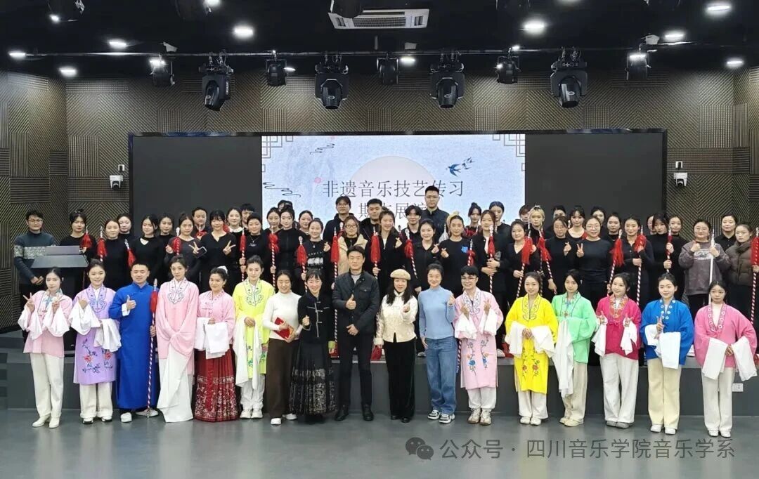 本次课程的汇演由任课教师董科副教授精心策划,围绕四川非遗音乐技艺的传承与实践展开。在课程的实施过程中,始终坚持以“课程群+模块化”建设为抓手,将“非遗中的民族自信与文化传承”等思政内容嵌入我们的非遗专业核心课程,推动《巴蜀非遗技艺传承》在教学实践中落地生根,也引导同学们在学习具体技艺的同时,思考非遗所承载的文化价值与时代意义。