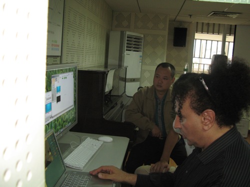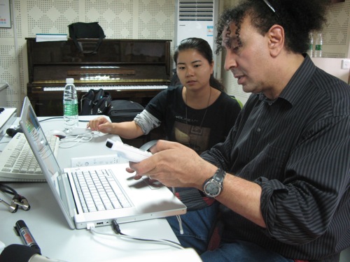 在琴房大楼音乐制作实验室中,Jeffrey Stolet教授以自己创作的交互式电子音乐作品“Thing do with my Fingers”为基础,讲授了利用Max/MSP/Jitter进行创作的技巧、方法,以及与视频结合的交互式电子音乐的创作思路。“Things I Do with my Fingers ”由任天堂wii的蓝牙无线感应控制器来共同完成的作品,包含了声音和视频的多媒体互动作品。