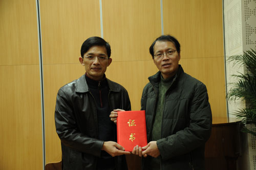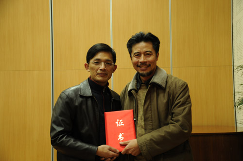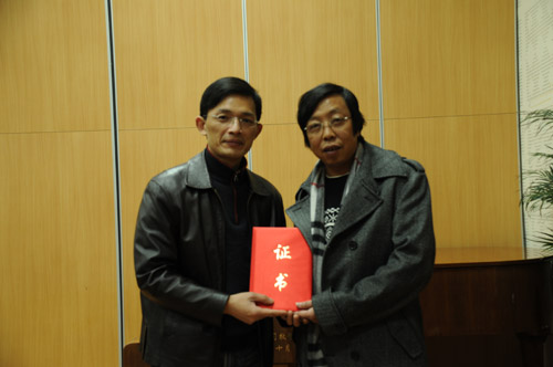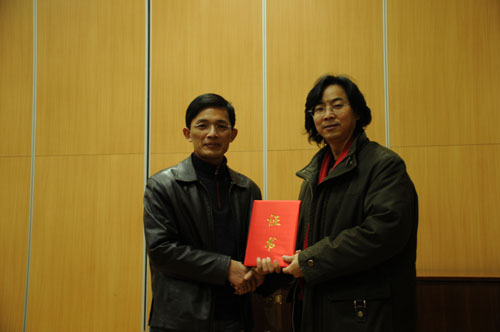 上海音乐学院正式启动“现当代华人作曲家作品手稿典藏与研究”项目计划。全国九大音乐学院以及北京、香港、南京等地70多位作曲家的150多部手稿已被装进专门制作的收藏盒内。我院作曲系宋名筑、邹向平、施子伟和胡晓四位老师的部分作品手稿被收录其中。这些手稿将存放于上音图书馆专门为此修建的恒温恒湿特藏室中,供全世界作曲家、理论家、学者的观摩和研究。2011年秋,上音图书馆将与国家图书馆联手举办“现当代华人作曲家作品手稿展览、研讨及作品展演活动”。 此次讲学活动中,上音图书馆馆长钱仁平教授代表上海音乐学院向我院四位作曲家颁发了手稿典藏证书。