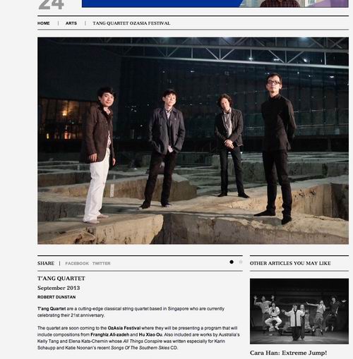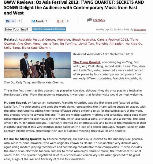 澳大利亚阿德莱德国际艺术节的重要组成部份OzAsia 艺术节音乐会在阿德莱德艺术中心的天空剧院上演我系教师胡小鸥博士的弦乐四重奏[麽些]第二号,演奏者为来自新加坡杨秀桃音乐学院的驻院四重奏,著名先锋乐团唐四重奏,不久前该乐团刚在澳洲墨尔本亚太室内乐国际比赛上作为嘉宾上演了胡小鸥的[麽些]第一号。 阿德莱德国际艺术节始于1960,每年在南澳大利亚首府阿德莱德举行没,是享誉世界的大型艺术节活动。其内容包括视觉,绘画,音乐,戏剧,舞蹈,文献展等众多方面。 作为阿德莱德OzAsia 艺术节重点介绍的两位海外作曲家(非澳大利亚本土作曲家,另一位是来自阿塞拜疆的著名女作曲家Franghiz All-zadeh), 胡小鸥将于2014-2015获得与著名的澳大利亚双年艺术节“空间隔离2号”(spaced 2)艺术家合作跨界新作品的机会。合作项目由SPACED2提供,合作者将为著名视觉设计师,来自美国波士顿罗德岛设计学院的丹尼尔.皮特斯教授。 作曲系 2013年9月24日