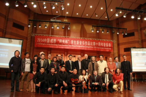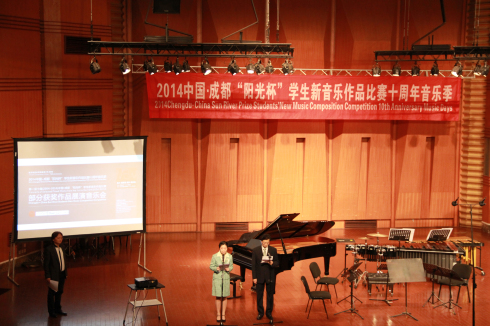音乐会开始之前,第十届(2014)“阳光杯”学生新音乐作品比赛评委会主席何训田教授代表本届评委会宣布了2014中国•成都“阳光杯”学生新音乐作品比赛的获奖学生名单。本届赛事共收到来自中国、中国香港、美国、英国、德国、俄罗斯、韩国、希腊、巴西、斯洛文尼亚、克罗地亚、以色列等不同国家和地区的71部参赛作品。通过评委会三轮认真评选,最终6部作品获等次将并颁发证书与奖金,6部作品获作品奖并颁发证书。