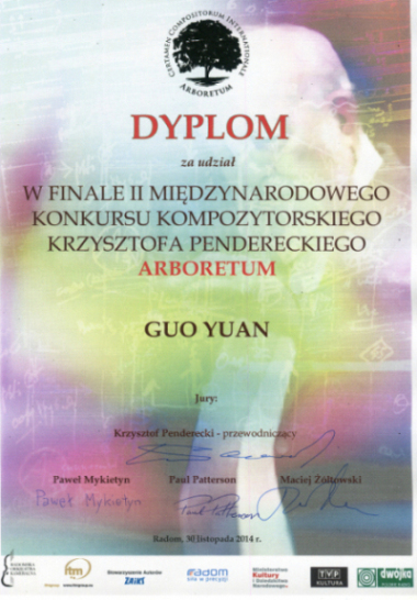 郭元获第二届克里斯托弗•潘德列斯基国际作曲比赛入围奖