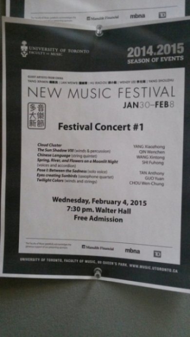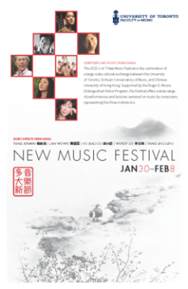2015加拿大多伦多大学新音乐节于2015年1月30日至2月8号在加拿大多伦多大学音乐学院举行。本次音乐节是整个多伦多大学音乐学院与伟德bv国际体育、香港中文大学联合学术交流项目的最后一站,也是整个音乐文化交流活动的最高潮。
