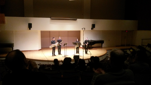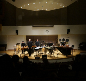 在2月4日当晚的室内乐音乐会上,我院作曲系杨晓忠教授的打击乐作品《云团》(—为五位打击乐手而作)作为开场。舞台分为3个音响区域:4台马林巴和颤音琴位于前区,4套康加和班戈置于中区,鼓类和金属类呈扇形列于后区,演奏员(4+1)和乐器配置构成音色的统一性(4)和染色关系(1)。全曲以动态的音乐形象描绘变幻莫测的对流云团,从这一自然现象,似乎也折射出人类翻卷动荡的心灵世界。