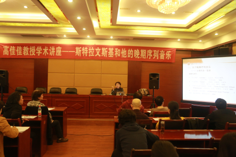 学术交流的讲座部分,于2016年10月24日上午在我院梧桐楼举行,是由中国音乐学院作曲系主任高佳佳教授,为我们带来的一场主题为“斯特拉文斯基和他的晚期序列音乐”的专题讲座。 此次讲座由作曲系主任杨晓忠教授主持。在讲座中,高佳佳教授首先为我们介绍了斯特拉文斯基的创作情况,尤其是斯特拉文斯基晚期序列音乐创作的具体分期以及代表作品。之后,她针对斯特拉文斯基晚期序列音乐的创作,通过对其早期序列音乐《纪念迪兰.托马斯》、中后期序列音乐《二重卡农》、《变奏曲》等多个作品的详尽分析与纵横比较,向大家阐述了斯特拉文斯基序列音乐创作的个性化特征,以及其不同创作阶段、不同作品在序列创作技术上的差异化和技术演变。整场讲座,高佳佳教授的讲述不仅严谨、细致,其对谱面的详尽分析,更让在场的听众受益匪浅,不仅开阔了学科视野,更让师生们拓展了音乐作品研究的新思路。
