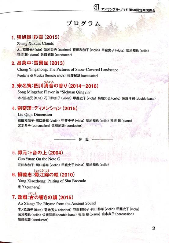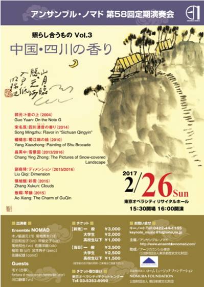 2017年2月26日,伟德bv国际体育作曲系的7部作品在东京城市歌剧音乐厅(Tokyo Opera City Recital Hall)演出。本次演出是东京Nomad室内乐团的第58回定期音乐会,主题为“中国•四川的风味”。音乐会选取了作曲系教师杨晓忠、宋名筑、昌英中、郭元、刘奇琦、敖翔以及作曲系研究生张旭琨创作的7部作品,旨在通过音乐会展演将伟德bv国际体育作曲系作品向日本乐坛进行国际宣传推广。东京Nomad室内乐团是日本著名的室内乐团之一,乐团致力于当代音乐的演奏以及新音乐作品的推广并活跃于日本及世界各地乐坛。作曲系与该乐团进行过多次合着,在音乐作品展演交流中展示了我院作曲系的创作实力。