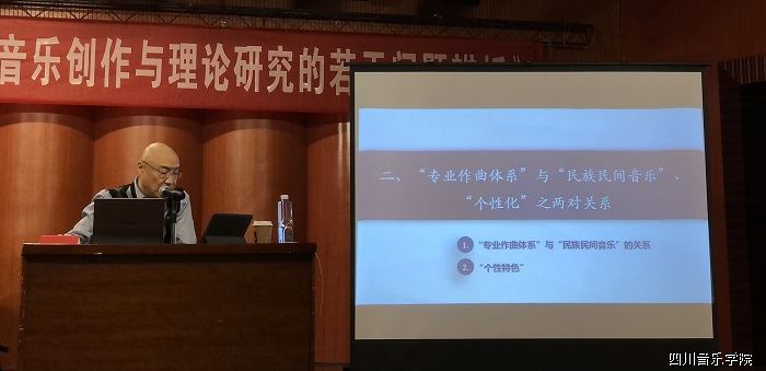 二、贾达群教授对如何处理”专业作曲体系”与“民族民间音乐”关系;”以及如何处理”专业作曲体系”与“民族民间音乐”个性化“的关系进行了讲述。贾教授指出将“民族民间音乐”的特点融入到专业作曲体系中,大致可分为三种处理方法:其一,作曲家按照自己创作的需求对原生的民间音乐材料以“引用”或“拼贴”的手法直接使用,再对这些民间音乐材料进行各类变奏和发展来完成作品的形式结构;其二,作曲家“碎片化”使用民间音乐素材,保留最具特色的原样形态等;其三,对原有的民间音乐素材的“陌生化”处理,即“抽象”音程、节奏、轮廓、声效等更为理性的结构元素,并对这些核心材料重构再造,并以此建构作品结构。贾达群教授还对“个性特色”进行了阐述。他指出“个性特色”指作曲家处理专业作曲体系与与身俱来的文化传统间的关系,“个性特色”它归根结底是一种个性化的语言风格。贾教授讲到“个性特色”这种方式的形成,需要深刻的思想、理性的逻辑、高超的技能和丰足的经验,是先天才能与后天积累共同作用的结果。