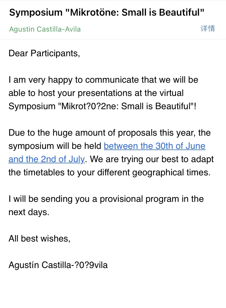 与此同时,研究生肖悦同学的另一篇论文《陈晓勇〈日记之五〉四分之一音作曲技法探析》(Xiaoyong Chen Diary V An exploration of quarter-tone composition techniques)(指导老师,胡晓教授)入选由奥地利学术机构International Society for Ekmelic Music主办的Symposium“Mikrotöne:Small is beautiful”国际学术会议,该论文将于6月30日至7月2日在该学术机构举办的国际研讨会上进行论文宣讲。