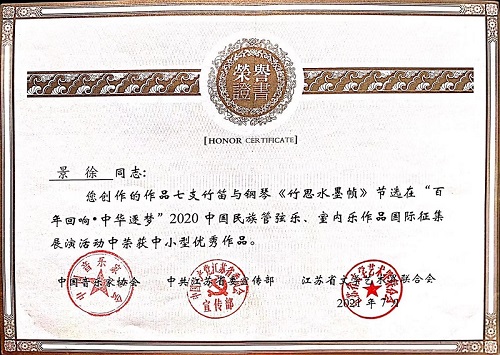 2021年4月3日,在苏州民族管弦乐团音乐厅举办的“‘百年回响•中华逐梦’2020中国民族室内乐作品国际征集终评音乐会”中,十部入围作品经由专家遴选,作曲系敖翔副教授的作品《踏月行歌》荣获中小型优秀作品(排名第五)、《如梦》荣获中小型优秀作品;景徐老师的作品《竹思水墨帧》荣获中小型优秀作品。