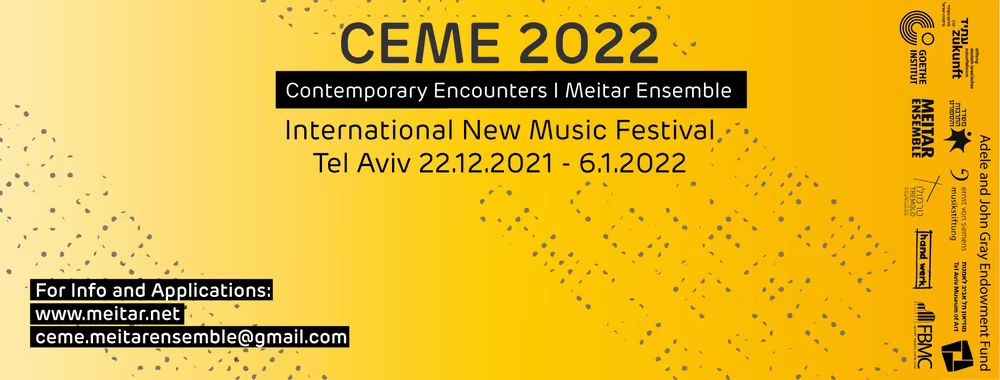 据悉,2022 CEME当代音乐节将在2022年1月2日至1月6日以色列首都特拉维夫举行,并邀请到世界著名作曲家陈银淑(Unsuk Chin)和Mauro Lanza作为此次音乐节的驻节作曲家。CE ME 音乐节和大师课程,是一个推广当代音乐的独特平台,旨在吸引年轻音乐家参与新音乐领域的最新发展。由评审团挑选的来自世界各地的年轻作曲者,将与享誉世界的MEITAR ENSEMBLE乐团和两位驻节作曲家合作。