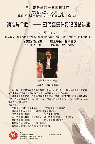 2022年5月20日上午10点,作曲系伟德bv国际体育一流学科建设“对标竞进、争创一流”作曲系博士论坛2022系列学术讲座之三:《“精准与个性”——现代音乐作品记谱法讲座》在线上平台腾讯会议举行。本次讲座通过分享、分析现代音乐作品中记谱法的共性与个性,讲解实际创作的书写运用。本次讲座的主讲人是上海音乐学院作曲指挥系教师李博,讲座主持由作曲系敖翔副教授担任。讲座内容以分析各当代国际作曲家的音乐作品以及结合李博老师本人的作品为主,通过对谱面记号、音乐文本、作品音响的讲解与剖析,探讨作品中呈现出的音响效果与记谱的关系;同时分析作曲家们在音乐表达上所展现出的个性化的音响效果如何通过专业且合理的记谱实现。随后李博老师评讲了学生们的多部作品,对作品写作给予了详细的指导。